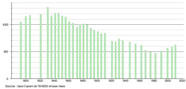 - Dans le tableau des recensements et le graphique, par convention dans Wikipédia, le principe a été retenu, pour les populations légales postérieures à 1999 de n’afficher dans le tableau des recensements et le graphique que les populations correspondant à l'année 2006, première population légale publiée calculée conformément aux concepts définis dans le décret no 2003-485 du 5 juin 2003, et les années correspondant à une enquête exhaustive de recensement pour les communes de moins de 10 000 habitants, ainsi que la dernière population légale publiée par l’Insee.