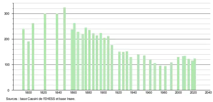 L'évolution du nombre d'habitants est connue à travers les recensements de la population effectués dans la commune depuis 1793. Pour les communes de moins de 10 000 habitants, une enquête de recensement portant sur toute la population est réalisée tous les cinq ans, les populations légales des années intermédiaires étant quant à elles estimées par interpolation ou extrapolation[11]. Pour la commune, le premier recensement exhaustif entrant dans le cadre du nouveau dispositif a été réalisé en 2008[12].