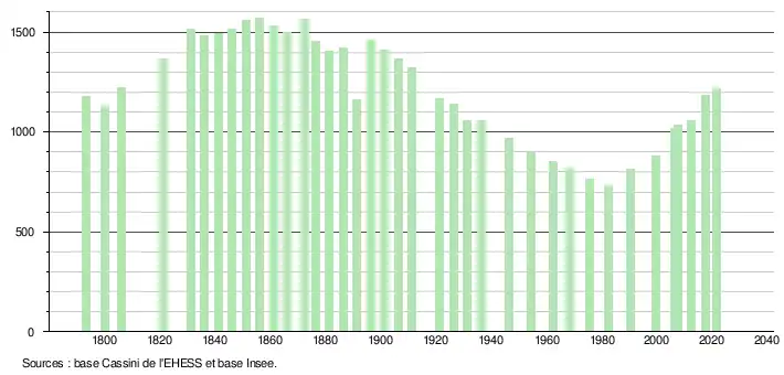 L'évolution du nombre d'habitants est connue à travers les recensements de la population effectués dans la commune depuis 1793. Pour les communes de moins de 10 000 habitants, une enquête de recensement portant sur toute la population est réalisée tous les cinq ans, les populations légales des années intermédiaires étant quant à elles estimées par interpolation ou extrapolation[27]. Pour la commune, le premier recensement exhaustif entrant dans le cadre du nouveau dispositif a été réalisé en 2007[28].
