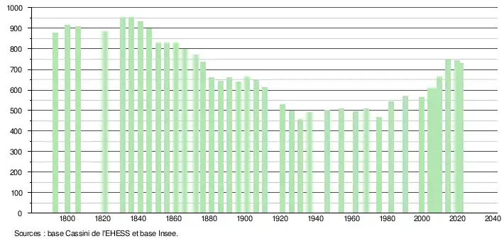 L'évolution du nombre d'habitants est connue à travers les recensements de la population effectués dans la commune depuis 1793. Pour les communes de moins de 10 000 habitants, une enquête de recensement portant sur toute la population est réalisée tous les cinq ans, les populations légales des années intermédiaires étant quant à elles estimées par interpolation ou extrapolation[17]. Pour la commune, le premier recensement exhaustif entrant dans le cadre du nouveau dispositif a été réalisé en 2004[18].