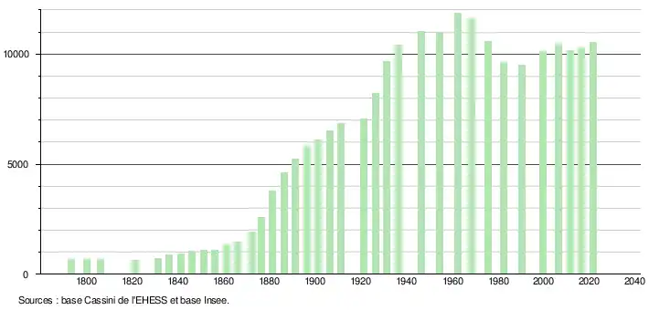 - Par convention dans Wikipédia, le principe a été retenu de n’afficher dans le tableau des recensements et le graphique, pour les populations légales postérieures à 1999, que les populations correspondant à une enquête exhaustive de recensement pour les communes de moins de 10 000 habitants, et que les populations des années 2006, 2011, 2016, etc. pour les communes de plus de 10 000 habitants, ainsi que la dernière population légale publiée par l’Insee pour l'ensemble des communes.