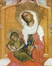 Ce tableau peint sur une planche en bois de peuplier représente une Vierge en majesté. Il s'agit d'une œuvre de l’École de Bohême attribuée au Maître de Hohenfurth, réalisée à la demande du premier archevêque de Prague, Ernst (Arnestus) von Pardubitz, que l'on voit d'ailleurs représenté à genoux en bas à gauche. La Vierge Marie se tient assise sur un trône de style gothique, sur un fond tendu d'un dais en or. De la main droite elle retient l'Enfant assis sur son genou, et elle tient l’orbe dans sa main gauche. Du point de vue iconographique, Marie siège sur le « trône de Sagesse » (Sedes sapientiae), comme le rappellent les Litanies de Lorette. Selon la Vita Venerabilis Arnesti du jésuite Bohuslav Balbín (1664), ce tableau devait à l'origine former la partie centrale d'un polyptyque à cinq panneaux.