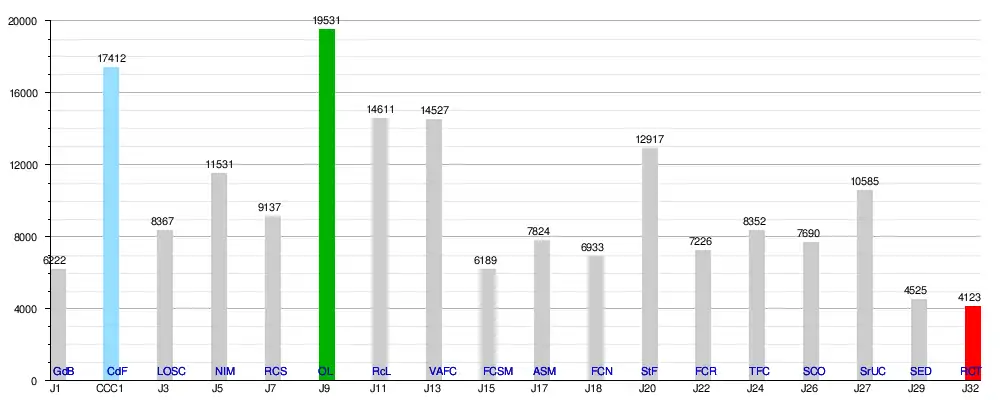 177.702 spectateurs ont assisté à des rencontres de l'AS Saint-Etienne en 18 rencontres. Soit une moyenne de 9872 spectateurs.