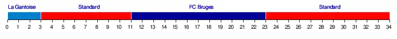 Après cinq journées de championnat, le Standard compte le maximum de points et possède une avance de deux points sur Anderlecht et cinq points sur La Gantoise. Le club principautaire perdra ses premières unités lors de la sixième journées en partageant l'enjeu à Gentbrugge face aux Buffalos. Les Liégeois retrouvent cependant rapidement le chemin de la victoire et comptent, au soir de la neuvième journée, cinq points d'avance sur leur plus proche poursuivant alors que le grand rival anderlechtois ne pointe qu'à la sixième place avec sept unités de retard.