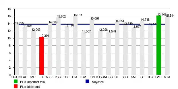 | 14 | FC Nantes | 45 | 38 | 15 | -11 |