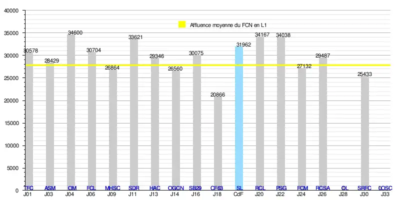 - de 441 900 spectateurs en 16 rencontres de Ligue 1, soit une moyenne de 27 619/match.