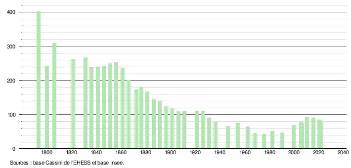 L'évolution du nombre d'habitants est connue à travers les recensements de la population effectués dans la commune depuis 1793. Pour les communes de moins de 10 000 habitants, une enquête de recensement portant sur toute la population est réalisée tous les cinq ans, les populations légales des années intermédiaires étant quant à elles estimées par interpolation ou extrapolation[29]. Pour la commune, le premier recensement exhaustif entrant dans le cadre du nouveau dispositif a été réalisé en 2005[30].