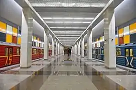 Elle est conçue par les architectes F.I.Tarasov, N.D.Deev et D.Zh.Polyakov[5], dans le style constructivisme russe avec une décoration utilisant la répétition de la figure géométrique carré, déclinée, au sol, au plafond et sur les murs, avec différents matériaux et colories. Au niveau de la surface, elle dispose de deux pavillons l'un pour les entrées et l'autre pour les sorties car sa conception interne prévoit une séparation des flux entrants et sortants. Suivant ce principe le quai central, encadré par deux voies, n'est accessible que par un côté, l'autre étant réservé à la sortie.