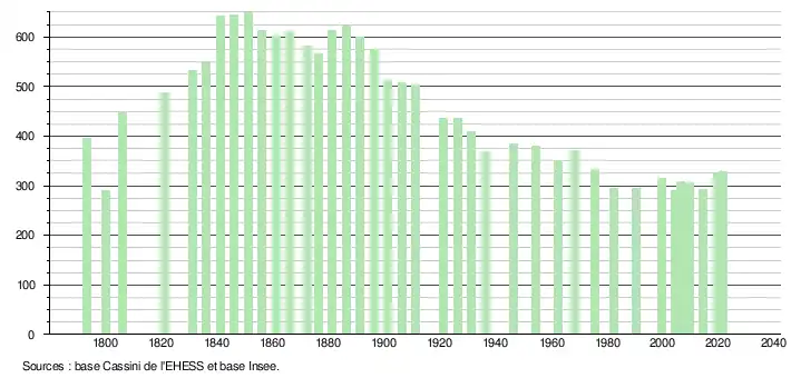 L'évolution du nombre d'habitants est connue à travers les recensements de la population effectués dans la commune depuis 1793. Pour les communes de moins de 10 000 habitants, une enquête de recensement portant sur toute la population est réalisée tous les cinq ans, les populations légales des années intermédiaires étant quant à elles estimées par interpolation ou extrapolation[19]. Pour la commune, le premier recensement exhaustif entrant dans le cadre du nouveau dispositif a été réalisé en 2004[20].
