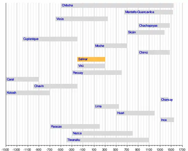 Lorsque la culture Chavín (vers à ) commence à décliner, sur la côte nord, de petits seigneuries en contact entre elles, se joignent et forment la culture salinar, qui commence entre et et se termine vers