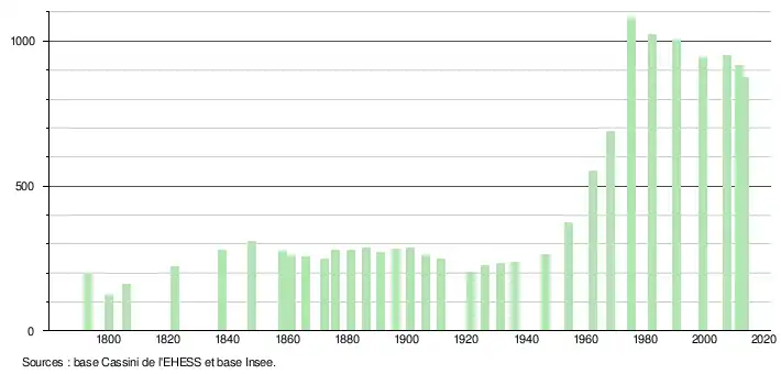 L'évolution du nombre d'habitants est connue à travers les recensements de la population effectués dans la commune depuis 1793. À partir du , les populations légales des communes sont publiées annuellement dans le cadre d'un recensement qui repose désormais sur une collecte d'information annuelle, concernant successivement tous les territoires communaux au cours d'une période de cinq ans. Pour les communes de moins de 10 000 habitants, une enquête de recensement portant sur toute la population est réalisée tous les cinq ans, les populations légales des années intermédiaires étant quant à elles estimées par interpolation ou extrapolation[5]. Pour la commune, le premier recensement exhaustif entrant dans le cadre du nouveau dispositif a été réalisé en 2007[6],[Note 1].