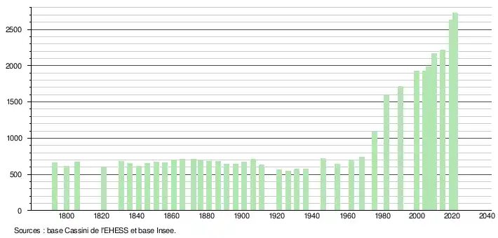 | L'évolution du nombre d'habitants est connue à travers les recensements de la population effectués dans la commune depuis 1793. Pour les communes de moins de 10 000 habitants, une enquête de recensement portant sur toute la population est réalisée tous les cinq ans, les populations légales des années intermédiaires étant quant à elles estimées par interpolation ou extrapolation[30]. Pour la commune, le premier recensement exhaustif entrant dans le cadre du nouveau dispositif a été réalisé en 2004[31]. En 2021, la commune comptait 2 728 habitants[Note 3], en augmentation de 15,4 % par rapport à 2015 (Gironde : +6,88 %, France hors Mayotte : +1,84 %). |