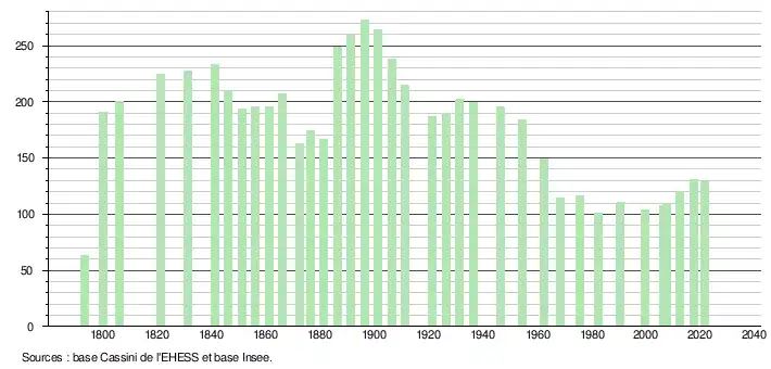 L'évolution du nombre d'habitants est connue à travers les recensements de la population effectués dans la commune depuis 1793. Pour les communes de moins de 10 000 habitants, une enquête de recensement portant sur toute la population est réalisée tous les cinq ans, les populations légales des années intermédiaires étant quant à elles estimées par interpolation ou extrapolation[25]. Pour la commune, le premier recensement exhaustif entrant dans le cadre du nouveau dispositif a été réalisé en 2007[26].