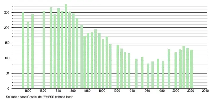 L'évolution du nombre d'habitants est connue à travers les recensements de la population effectués dans la commune depuis 1793. Pour les communes de moins de 10 000 habitants, une enquête de recensement portant sur toute la population est réalisée tous les cinq ans, les populations légales des années intermédiaires étant quant à elles estimées par interpolation ou extrapolation[43]. Pour la commune, le premier recensement exhaustif entrant dans le cadre du nouveau dispositif a été réalisé en 2005[44].