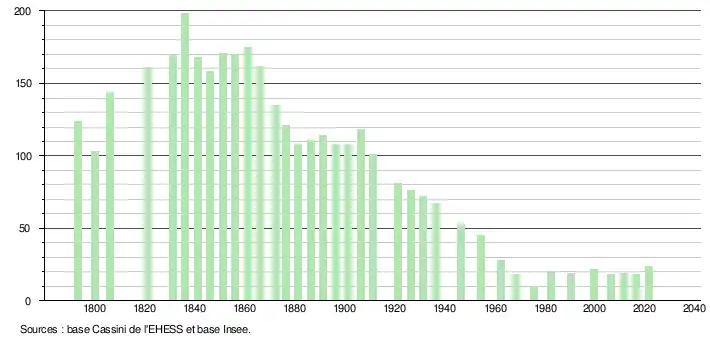 L'évolution du nombre d'habitants est connue à travers les recensements de la population effectués dans la commune depuis 1793. Pour les communes de moins de 10 000 habitants, une enquête de recensement portant sur toute la population est réalisée tous les cinq ans, les populations légales des années intermédiaires étant quant à elles estimées par interpolation ou extrapolation[26]. Pour la commune, le premier recensement exhaustif entrant dans le cadre du nouveau dispositif a été réalisé en 2006[27].