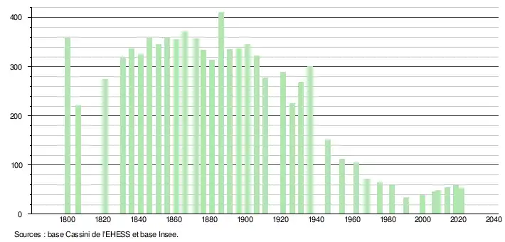L'évolution du nombre d'habitants est connue à travers les recensements de la population effectués dans la commune depuis 1800. Pour les communes de moins de 10 000 habitants, une enquête de recensement portant sur toute la population est réalisée tous les cinq ans, les populations légales des années intermédiaires étant quant à elles estimées par interpolation ou extrapolation[7]. Pour la commune, le premier recensement exhaustif entrant dans le cadre du nouveau dispositif a été réalisé en 2008[8].