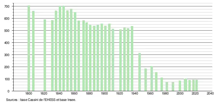 L'évolution du nombre d'habitants est connue à travers les recensements de la population effectués dans la commune depuis 1800. Pour les communes de moins de 10 000 habitants, une enquête de recensement portant sur toute la population est réalisée tous les cinq ans, les populations légales des années intermédiaires étant quant à elles estimées par interpolation ou extrapolation[7]. Pour la commune, le premier recensement exhaustif entrant dans le cadre du nouveau dispositif a été réalisé en 2007[8].