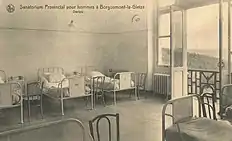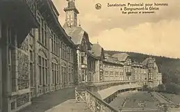 - 23 septembre 1903-1947 : Le sanatorium ouvre ses portes et reste en activité jusqu'à l'après-guerre[2]. Lors de la Première Guerre mondiale, le sanatorium ne sera pas affecté malgré la présence, à Spa, du quartier général du Kaiser Guillaume II. La Seconde Guerre mondiale permit de dissimuler, parmi les patients tuberculeux, des Juifs en parfaite santé. C'est également au pied de la colline que s'arrêtera, en décembre 1944, l'offensive Von Rundstedt. Il faut noter que c'est pendant la Seconde Guerre mondiale que sera créé à Borgoumont le premier Service Social Provincial[4] Après la Seconde Guerre, le recours aux antibiotiques permet de mieux traiter la tuberculose et les activités s'orientent de plus en plus vers le traitement d'autres maladies pulmonaires telles que l'anthraco-silicose des mineurs.