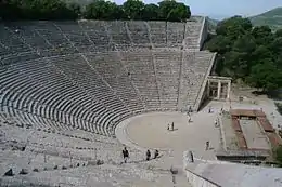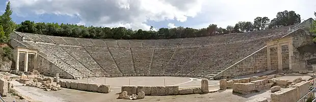 Le théâtre d'Épidaure est le mieux conservé et passe pour le plus accompli de tous les théâtres grecs antiques. Probablement construit au début du IIIe siècle av. J.-C.[1], il est parvenu jusqu'à nous dans un état exceptionnel. Les gradins de calcaire gris, presque tous d'origine, n'ont été restaurés que sur les deux ailes. L'attribution traditionnelle de la construction du théâtre à Polyclète le Jeune, architecte de la tholos qui vivait au IVe siècle av. J.-C., due à Pausanias[3],[4], ne semble plus guère admise[1].