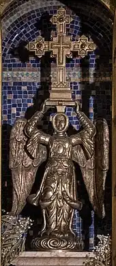 La statue titulaire du sanctuaire présente une iconographie très ancienne et particulière : au lieu d'être représenté éloignant les démons ou pesant les âmes dans une balance, comme d'habitude, elle apparaît comme le transporteur de la sainte croix, signe de la victoire du Christ. Leur inspiration doit provenir des textes bibliques, patristiques[2] et liturgiques qui présentent saint Michel comme le signífero de Dieu, le "lieutenant" du Christ Roi. L'actuelle effigie de saint Michel d'Excelsis est un reliquaire d'argent surdoré réalisé en 1756 pour remplacer le précédent. On trouve à l'intérieur les restes de l'ancienne statue de bois et un « lignum crucis » ou relique de la croix du Christ. L'ange est au centre, et est l'objet d'une dévotion populaire en Navarre et au Guipuscoa. De fait, année après année, cette statue vénérée abandonne son sanctuaire le jour de Pâques et de la Résurrection et reste au dehors tous les trois mois, le temps qu'elle visite près de 280 villages de Navarre. Dans beaucoup de ceux-ci la statue de l'ange et ses transporteurs logent dans les maisons des membres de la Fraternité de Saint Michel, institution qui regroupe les familles qui offrent ce service inestimable. Des soins rituels règlent la visite de l'archange et de sa croix à chaque village : bénédiction des terres avec la statue et proclamation des Évangiles aux quatre points cardinaux, visite aux patients… Elle entre aussi au Guipuscoa le second dimanche d'août avec le pèlerinage à l'ermitage d'Igaratza. L'une des sorties des plus anciennes est celle que l'archange effectue dans la ville de Pampelune, où il passe une semaine, visitant des paroisses, couvents, hôpitaux, des centres éducatifs, et institutions publiques, bien que le motif principal de son arrivée à la ville soit la participation à la festivité du Dévouement de la Cathédrale (mardi suivant la huitième de Pâques).