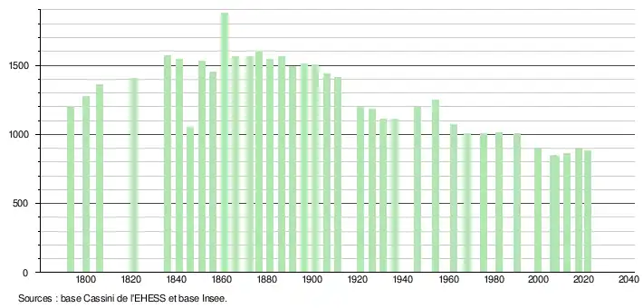 L'évolution du nombre d'habitants est connue à travers les recensements de la population effectués dans la commune depuis 1793. Pour les communes de moins de 10 000 habitants, une enquête de recensement portant sur toute la population est réalisée tous les cinq ans, les populations légales des années intermédiaires étant quant à elles estimées par interpolation ou extrapolation[17]. Pour la commune, le premier recensement exhaustif entrant dans le cadre du nouveau dispositif a été réalisé en 2007[18].