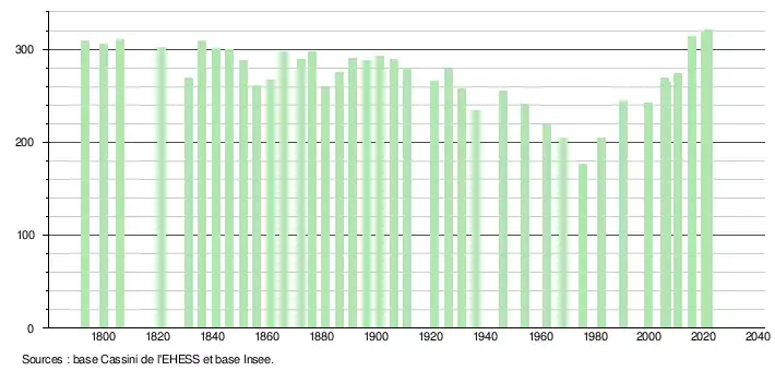 L'évolution du nombre d'habitants est connue à travers les recensements de la population effectués dans la commune depuis 1793. Pour les communes de moins de 10 000 habitants, une enquête de recensement portant sur toute la population est réalisée tous les cinq ans, les populations légales des années intermédiaires étant quant à elles estimées par interpolation ou extrapolation[25]. Pour la commune, le premier recensement exhaustif entrant dans le cadre du nouveau dispositif a été réalisé en 2005[26].