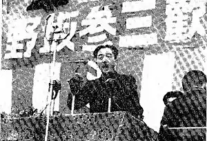 Le Parti communiste japonais progresse dans les associations syndicales du pays et les parties socialistes, et aux élections législatives japonaises de 1949, le Parti remporte 10 % des votes. En , peu de temps avant l'entrée des États-Unis dans la guerre de Corée avec le soutien des Nations unies, le Kominform critique les politiques gradualistes du Parti communiste japonais et lui demande de perturber activement l'occupation américaine[38]. En , Sanzō Nosaka, avec Kiyuchi Tokuda, sont appelés devant les comités parlementaires par la Diète japonaise pour savoir s'ils conseillent aux Soviétiques de garder les prisonniers de guerre japonais en Russie jusqu'à leur complet endoctrinement au communisme. Cette action de la Diète se base sur une pétition envoyée au gouvernement et aux autorités alliées par un groupe d'anciens soldats japonais de retour de camps de prisonniers en Sibérie[39].