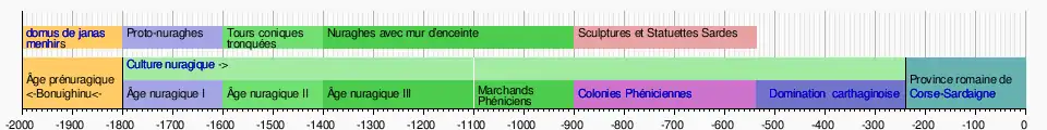 Apparaît ensuite la population plus célèbre des Nuraghes, de la culture nuragique[13], qui se développe à l'âge du bronze ancien () et qui décline progressivement à la fin de l'âge du fer () pour ne disparaître complètement qu'avec l'occupation romaine.