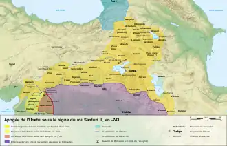 Il poursuit la politique de construction et d'embellissement commencée par son père. En 743 av. J.-C., l'Assyrie sort cependant de sa période sombre et il doit faire face à l'expansionnisme de son empereur Teglath-Phalasar III (745 à 727 av. J.-C.). Ce dernier remporte une victoire sur Sarduri II et ses alliés syriens, marche sur la capitale Tushpa, qui est prise en 735 av. J.-C.[2], et dévaste le royaume. Le pays d'Urartu traverse alors une grande crise politique qui conduit à la déchéance de Sarduri II la même année. La date de sa mort n'est pas connue.