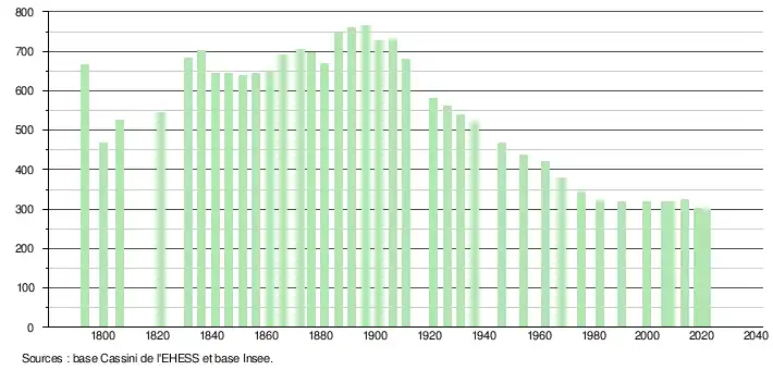 L'évolution du nombre d'habitants est connue à travers les recensements de la population effectués dans la commune depuis 1793. Pour les communes de moins de 10 000 habitants, une enquête de recensement portant sur toute la population est réalisée tous les cinq ans, les populations légales des années intermédiaires étant quant à elles estimées par interpolation ou extrapolation[32]. Pour la commune, le premier recensement exhaustif entrant dans le cadre du nouveau dispositif a été réalisé en 2008[33].