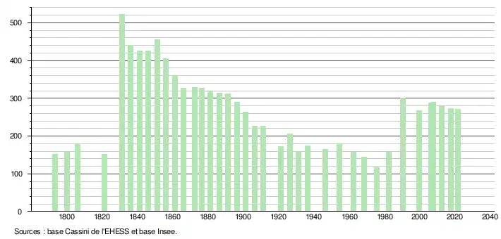 L'évolution du nombre d'habitants est connue à travers les recensements de la population effectués dans la commune depuis 1793. Pour les communes de moins de 10 000 habitants, une enquête de recensement portant sur toute la population est réalisée tous les cinq ans, les populations légales des années intermédiaires étant quant à elles estimées par interpolation ou extrapolation[21]. Pour la commune, le premier recensement exhaustif entrant dans le cadre du nouveau dispositif a été réalisé en 2007[22].