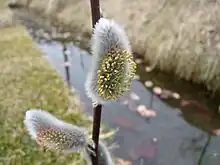 Cette espèce étant dioïque, les individus sont soit mâle (voir 1 et photo ci-contre), soit femelle (voir 2), et leurs fleurs sont réunies en chatons unisexués. Chaque fleur est précédée d'un nectaire correspondant au périanthe, et protégée par une bractée. Les fleurs mâles (voir 3) ont deux étamines avec des anthères jaunes (voir photo ci-contre). Les fleurs femelles (voir 4) ne présentent qu'un seul ovaire uniloculaire à deux carpelles. Le fruit est une capsule velue qui s'ouvre par deux valves et libère des graines portant de longues soies.