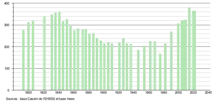 L'évolution du nombre d'habitants est connue à travers les recensements de la population effectués dans la commune depuis 1793. Pour les communes de moins de 10 000 habitants, une enquête de recensement portant sur toute la population est réalisée tous les cinq ans, les populations légales des années intermédiaires étant quant à elles estimées par interpolation ou extrapolation[22]. Pour la commune, le premier recensement exhaustif entrant dans le cadre du nouveau dispositif a été réalisé en 2004[23].