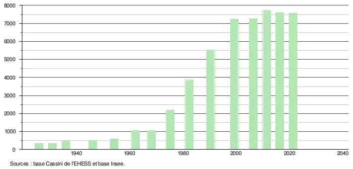 L'évolution du nombre d'habitants est connue à travers les recensements de la population effectués dans la commune depuis 1926. Pour les communes de moins de 10 000 habitants, une enquête de recensement portant sur toute la population est réalisée tous les cinq ans, les populations légales des années intermédiaires étant quant à elles estimées par interpolation ou extrapolation[15]. Pour la commune, le premier recensement exhaustif entrant dans le cadre du nouveau dispositif a été réalisé en 2006[16].