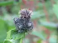 Les fleurs violettes à noires forment un capitule.