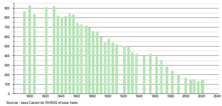L'évolution du nombre d'habitants est connue à travers les recensements de la population effectués dans la commune depuis 1793. Pour les communes de moins de 10 000 habitants, une enquête de recensement portant sur toute la population est réalisée tous les cinq ans, les populations légales des années intermédiaires étant quant à elles estimées par interpolation ou extrapolation[27]. Pour la commune, le premier recensement exhaustif entrant dans le cadre du nouveau dispositif a été réalisé en 2005[28].