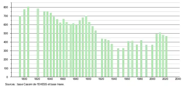 L'évolution du nombre d'habitants est connue à travers les recensements de la population effectués dans la commune depuis 1793. Pour les communes de moins de 10 000 habitants, une enquête de recensement portant sur toute la population est réalisée tous les cinq ans, les populations légales des années intermédiaires étant quant à elles estimées par interpolation ou extrapolation[19]. Pour la commune, le premier recensement exhaustif entrant dans le cadre du nouveau dispositif a été réalisé en 2006[20].