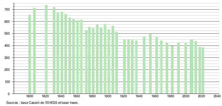 L'évolution du nombre d'habitants est connue à travers les recensements de la population effectués dans la commune depuis 1800. Pour les communes de moins de 10 000 habitants, une enquête de recensement portant sur toute la population est réalisée tous les cinq ans, les populations légales des années intermédiaires étant quant à elles estimées par interpolation ou extrapolation[29]. Pour la commune, le premier recensement exhaustif entrant dans le cadre du nouveau dispositif a été réalisé en 2007[30].