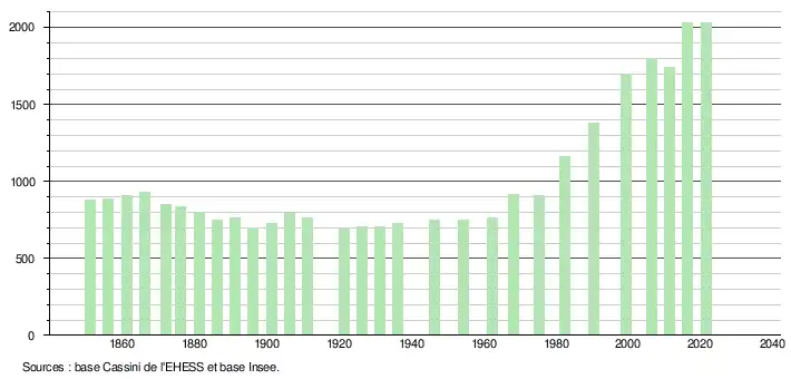 L'évolution du nombre d'habitants est connue à travers les recensements de la population effectués dans la commune depuis 1851. Pour les communes de moins de 10 000 habitants, une enquête de recensement portant sur toute la population est réalisée tous les cinq ans, les populations légales des années intermédiaires étant quant à elles estimées par interpolation ou extrapolation[34]. Pour la commune, le premier recensement exhaustif entrant dans le cadre du nouveau dispositif a été réalisé en 2006[35].