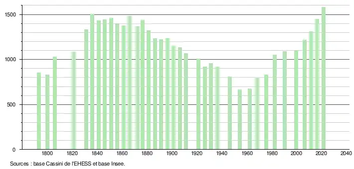 L'évolution du nombre d'habitants est connue à travers les recensements de la population effectués dans la commune depuis 1793. Pour les communes de moins de 10 000 habitants, une enquête de recensement portant sur toute la population est réalisée tous les cinq ans, les populations légales des années intermédiaires étant quant à elles estimées par interpolation ou extrapolation[34]. Pour la commune, le premier recensement exhaustif entrant dans le cadre du nouveau dispositif a été réalisé en 2006[35].