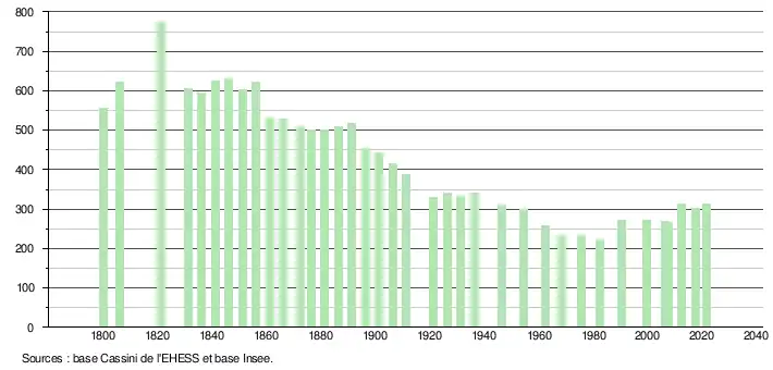 L'évolution du nombre d'habitants est connue à travers les recensements de la population effectués dans la commune depuis 1800. Pour les communes de moins de 10 000 habitants, une enquête de recensement portant sur toute la population est réalisée tous les cinq ans, les populations légales des années intermédiaires étant quant à elles estimées par interpolation ou extrapolation[22]. Pour la commune, le premier recensement exhaustif entrant dans le cadre du nouveau dispositif a été réalisé en 2007[23].