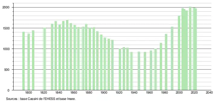 L'évolution du nombre d'habitants est connue à travers les recensements de la population effectués dans la commune depuis 1793. Pour les communes de moins de 10 000 habitants, une enquête de recensement portant sur toute la population est réalisée tous les cinq ans, les populations légales des années intermédiaires étant quant à elles estimées par interpolation ou extrapolation[18]. Pour la commune, le premier recensement exhaustif entrant dans le cadre du nouveau dispositif a été réalisé en 2004[19].