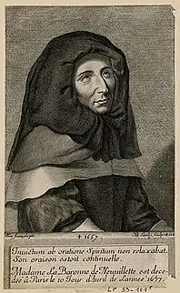 Devenue veuve, Mme de Neuvillette renonce à la vie mondaine et opère une conversion radicale, sous la direction du baron Gaston de Renty, « supérieur » de la Compagnie du Saint-Sacrement[Note 33].