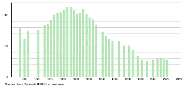 L'évolution du nombre d'habitants est connue à travers les recensements de la population effectués dans la commune depuis 1793. Pour les communes de moins de 10 000 habitants, une enquête de recensement portant sur toute la population est réalisée tous les cinq ans, les populations légales des années intermédiaires étant quant à elles estimées par interpolation ou extrapolation[14]. Pour la commune, le premier recensement exhaustif entrant dans le cadre du nouveau dispositif a été réalisé en 2006[15].