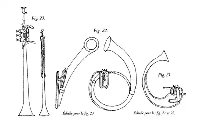 « Instruments à bocal avec un mécanisme de trois cylindres, d'une sonorité énorme, qui portent loin, et produisent un effet extraordinaire dans les orchestres militaires destinés à être entendus en plein air. […] La forme élégamment arrondie rappelle celle des trompettes antiques de grand format[16]. »