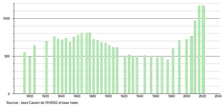 L'évolution du nombre d'habitants est connue à travers les recensements de la population effectués dans la commune depuis 1793. Pour les communes de moins de 10 000 habitants, une enquête de recensement portant sur toute la population est réalisée tous les cinq ans, les populations légales des années intermédiaires étant quant à elles estimées par interpolation ou extrapolation[24]. Pour la commune, le premier recensement exhaustif entrant dans le cadre du nouveau dispositif a été réalisé en 2005[25].