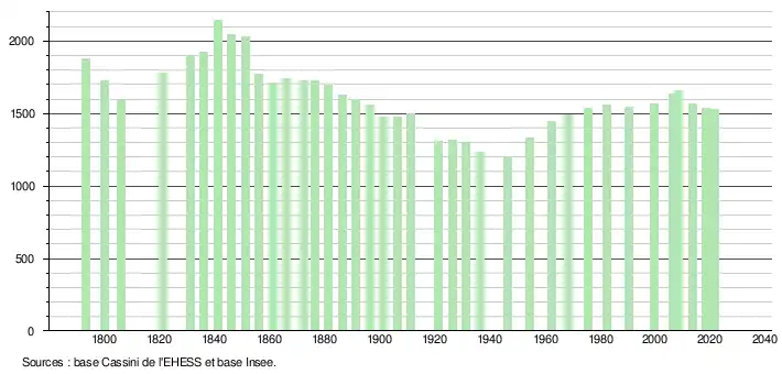 L'évolution du nombre d'habitants est connue à travers les recensements de la population effectués dans la commune depuis 1793. Pour les communes de moins de 10 000 habitants, une enquête de recensement portant sur toute la population est réalisée tous les cinq ans, les populations légales des années intermédiaires étant quant à elles estimées par interpolation ou extrapolation[25]. Pour la commune, le premier recensement exhaustif entrant dans le cadre du nouveau dispositif a été réalisé en 2008[26].