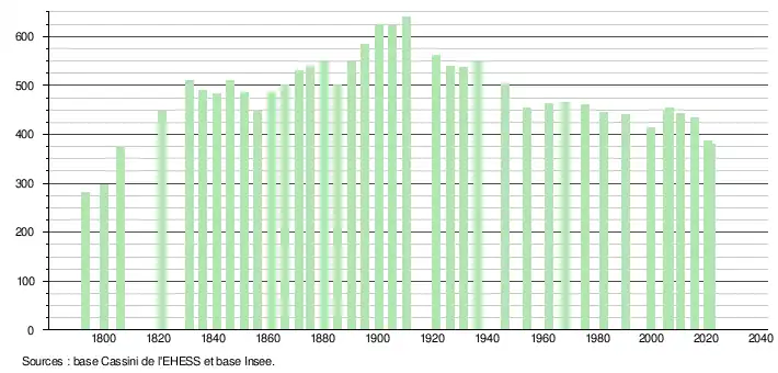 L'évolution du nombre d'habitants est connue à travers les recensements de la population effectués dans la commune depuis 1793. Pour les communes de moins de 10 000 habitants, une enquête de recensement portant sur toute la population est réalisée tous les cinq ans, les populations légales des années intermédiaires étant quant à elles estimées par interpolation ou extrapolation[28]. Pour la commune, le premier recensement exhaustif entrant dans le cadre du nouveau dispositif a été réalisé en 2005[29].