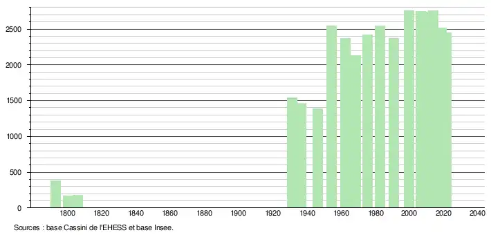 L'évolution du nombre d'habitants est connue à travers les recensements de la population effectués dans la commune depuis 1793. Pour les communes de moins de 10 000 habitants, une enquête de recensement portant sur toute la population est réalisée tous les cinq ans, les populations légales des années intermédiaires étant quant à elles estimées par interpolation ou extrapolation[23]. Pour la commune, le premier recensement exhaustif entrant dans le cadre du nouveau dispositif a été réalisé en 2008[24].
