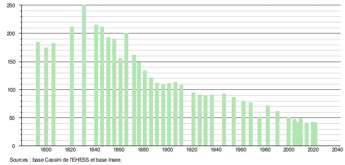 | L'évolution du nombre d'habitants est connue à travers les recensements de la population effectués dans la commune depuis 1793. Pour les communes de moins de 10 000 habitants, une enquête de recensement portant sur toute la population est réalisée tous les cinq ans, les populations légales des années intermédiaires étant quant à elles estimées par interpolation ou extrapolation[22]. Pour la commune, le premier recensement exhaustif entrant dans le cadre du nouveau dispositif a été réalisé en 2004[23]. En 2021, la commune comptait 42 habitants[Note 2], en augmentation de 2,44 % par rapport à 2015 (Gers : +0,79 %, France hors Mayotte : +1,84 %). |